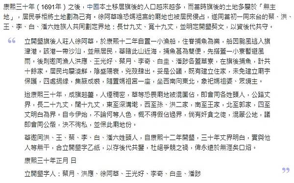 華邀同洪、王、蔡、李、白、潘六姓頭人,自康熙十二年開墾,三十年丈界明白,實與他人等無干,合立開墾字乙紙,以存後代共鑒,杜絕爭競之禍,俾永遠於無涯矣口炤。