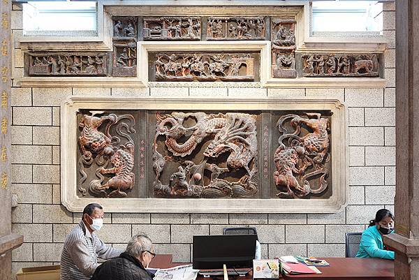 「龍虎堵石雕牆」為中西合併的設計,展現旗津的商埠文化。廟內石雕牆除了中式傳統龍、虎之外,當時的匠師在上方的水車堵帶入西式風格。(攝影/Carter)
