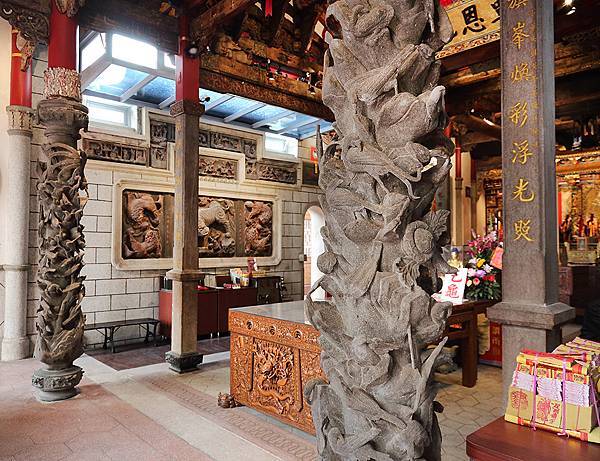 進入三川門門口之後,除了斗拱之外,就是各種造型及表現不同技法的石雕作品,其中包括龍柱、龍壁、虎壁、石獅和壁雕造型等,雕工頗有可看之處。廟宇縱深二落,左右為護龍的平面格局,東護室(左護龍)被分隔為四個小間,分別祀奉著同祀神。