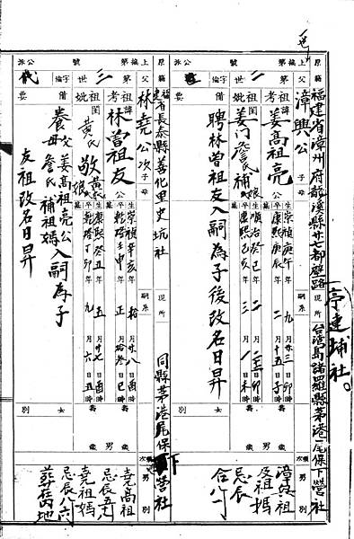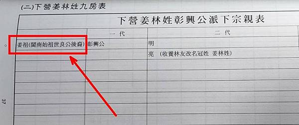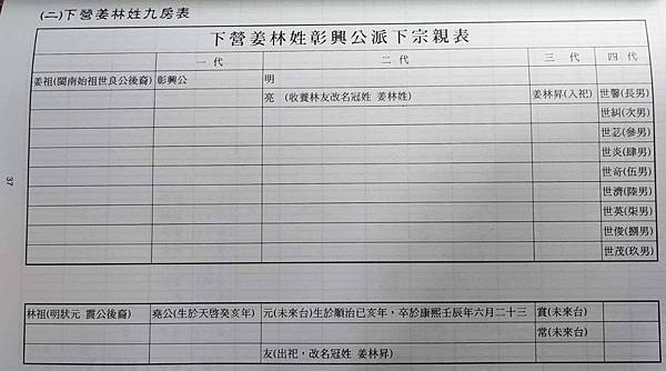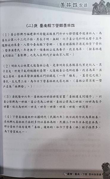 。……日昇公孝順養父母,絲毫莫逆。……林堯公父子分散,抱負不滿在心,未久返回元籍長泰縣,而心憔悴,介念友公。趁便就探訪而得知友公在姜家撫養之情形,立再奔台來姜家探親會面。如魚得水,父子盡歡。謝姜高祖亮公暨向詹祖媽之美儉養育之大恩。兩家俱大悅。林高祖堯公承說在姜家為養子乙事,願當尊意,那是兩家之幸福。堯公逗留幾天,欣暢拜別,返長泰縣。其後日昇公長大,亮公選媳。由日昇公娶室黃曾祖媽敬娘,也孝順翁姑,過日快樂。而全家相議將來後裔男女永久表現兩家本姓,曰姜林姓,為紀念後代之本姓由來。而到日據大正五年(民國五年)被日政府強迫削除林姓,因不容二姓之源由。吾們那是姜家養子姓姜合該然。但望吾們宗親代代流傳,敎子孫重懷,吾們那是祖籍漳州林姓親骨肉後裔,永久勿忘。此情緒希祈宗親們遵重,絕不是編者謬言就是。是此至矚。 據姜林姓龍泰堂廟祝姜東和先生所述,姜林姓始祖本名為姜林昇。日昇乃為日治時期撰寫族譜者筆誤。