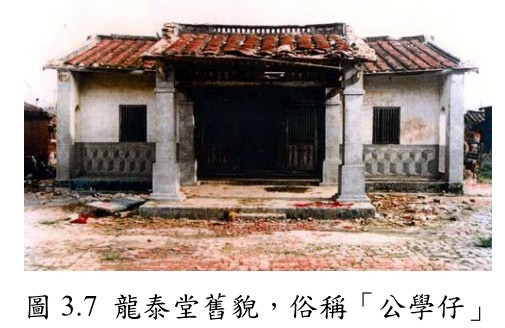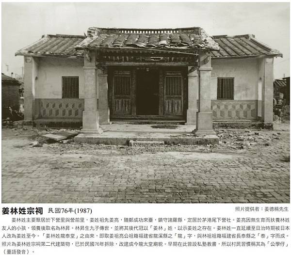 照片為姜林姓宗祠第二代建築物,已於民國76年拆除,改建成今龍太堂廟貌。早期在此曾設私塾教書,所以村民習慣稱其為「公學仔」