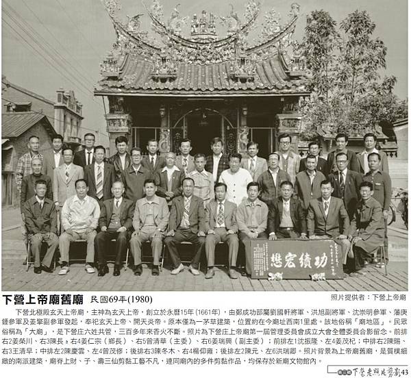 俗稱為「大廟」,是下營庄六姓共管,三百多年來香火不斷。照片為下營庄上帝廟第一屆管理委員會成立大會全體委員合影留念。前排