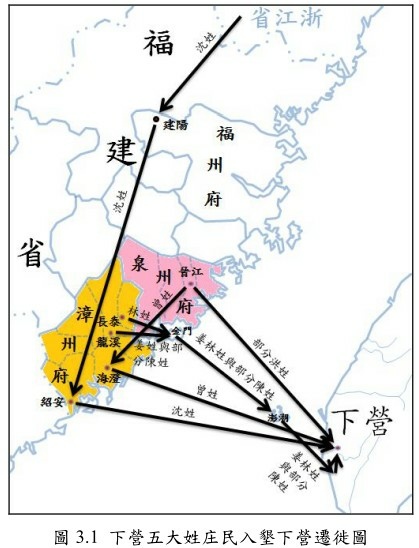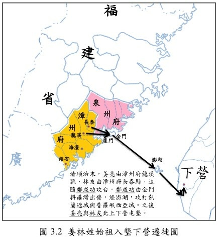 林姓下營高祖堯公次子林曾祖友公住漳州府長泰縣善化里彥坑社。隨父堯公從軍扶明鄭成功。在閩南地方(漳浦廈門)操練軍士。在鼓浪嶼關練水軍。被清迫近閩南而發動起兵攻佔台灣,驅逐荷蘭族。堯公父子隨鄭王部將林鳳公奉令巡掃荷蘭。自雞籠到林鳳營(今六甲區林鳳營)之時,林鳳公陣歿。由該地名曰表功績,乃林鳳營地名之由來。
