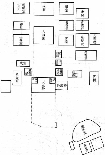 圖為湧泉寺於二十世紀的配置(資料來源:《中國文化史蹟》)。