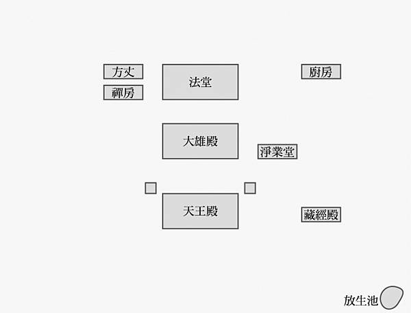 圖為湧泉寺於明朝時代的配置。天王殿丶大雄殿和法堂建於中軸線,廚房丶藏經殿和禪堂等建於左右兩側。其時尚未具備禪宗七堂伽藍的配置規模(資料來源:鼓山誌)。