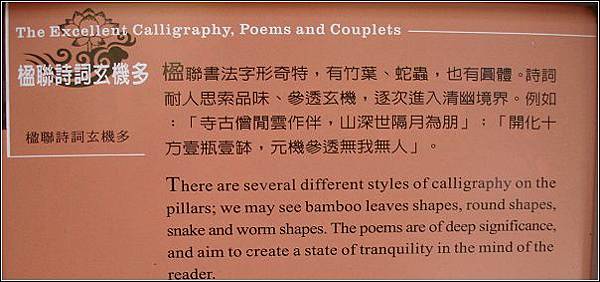 彌勒龕兩旁的柱子上刻有許多哲理高深的對聯,常見的有:「開口常笑,笑古笑今,凡事付之一笑;大肚能容,容天容地,與己何所不容。」;「大肚能容,容天下難容之事;開口便笑,笑世間可笑之人。」