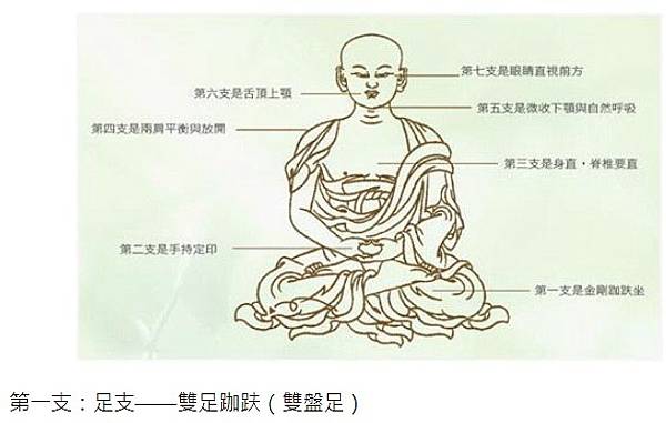 (9)七支的坐姿,因為雙足盤曲,兩手交叉,使四肢活動靜止,便可減輕心臟的負擔,所以靜止的時間愈久,對於恢復心臟功能的功效愈大。