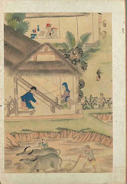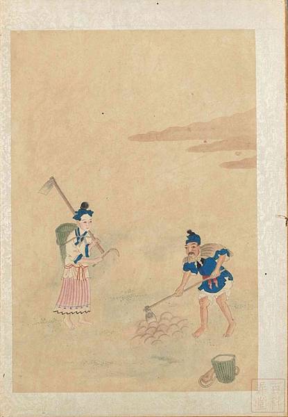 此《進貢苗蠻圖》繪有六十多幅清代苗民風俗圖,並每頁右附解說,夾板上題簽:進貢苗蠻圖,臣陳枚恭畫。(京都大學圖書館藏)