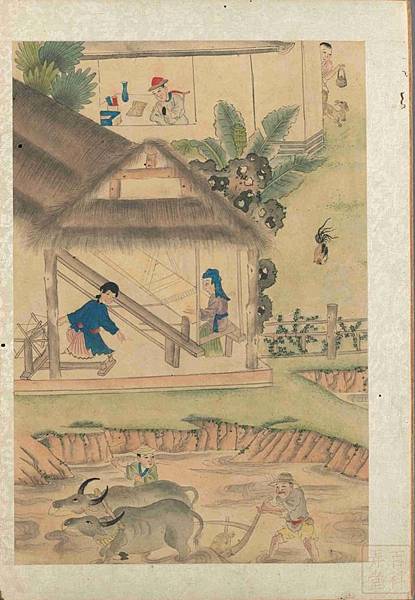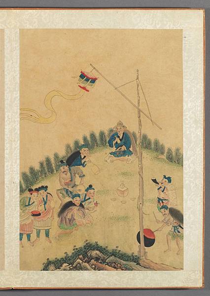 此本《苗族生活圖》屬於眾多類似《百苗圖》的一種。其內容是歷史上流傳下來的一種反映貴州地區古代少數民族的圖說文本。此本含40幅彩繪人物圖裱於20葉,配木夾板成一冊。(普林斯頓大學圖書館藏)