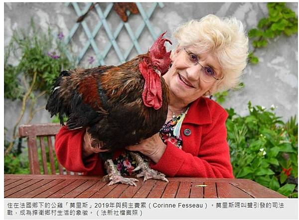 《法新社》報導,莫里斯清晨的啼叫聲,使得附近鄰居與牠的飼主費索(Corinne Fesseau)陷入長期爭執,鄰居一狀告上法院後,讓這隻公雞受到國際關注,不尋常案件也凸顯了城鄉居民想法大不相同。