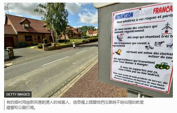 有的鄉村用幽默來應對湧入的城裏人,信息欄上提醒他們注意時不時出現的教堂鐘聲和公雞打鳴。