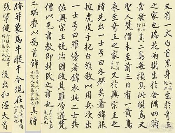 鐵柱記云:初三賧白大首領將軍張樂盡求並興宗王等九人,共祭天於鐵柱側。主鳥從鐵柱上飛憩興宗王之臂上焉。張樂盡求自此已後,益加驚訝。興宗王乃憶,此吾家之主鳥也,始自忻悅。此鳥憩興宗王家,經於一十一月後乃化矣。又有一犬,白首黑身,號為隴犬。生於奇王之家也。瑞花兩樹,生於舍隅,四時常發,俗云橙花。其二鳥每棲息此樹焉。又聖人梵僧未至前三日,有一黃鳥來至奇王之家,卽鷹子也。又於興宗王之時,先出一士,號曰各郡矣,着錦服,披虎皮,手把白旗,敎以用兵;次出一士,號曰羅傍,着錦衣。此二士共佐興宗王統治國政。其羅傍遇梵僧以乞書敎,卽封民之書也。其二士表文武也。後有天兵十二騎來助興宗王,隱顯有期,初期住於十二日,再期住於六日,後期住於三日。從此兵強國盛,闢土開疆,此亦阿嵯耶之化也。