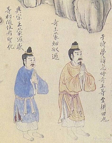 潯彌脚、夢諱等二人欲送耕飯。其時梵僧在奇王家內留住不去。潯彌脚等送飯至路中,梵僧已在前廻乞食矣。乃戴夢諱所施黑淡綵二端疊以為首飾,蓋貴重人所施之物也。後人效為首飾也。其時潯彌脚等所將耕飯,再亦廻施,無有恡惜之意。