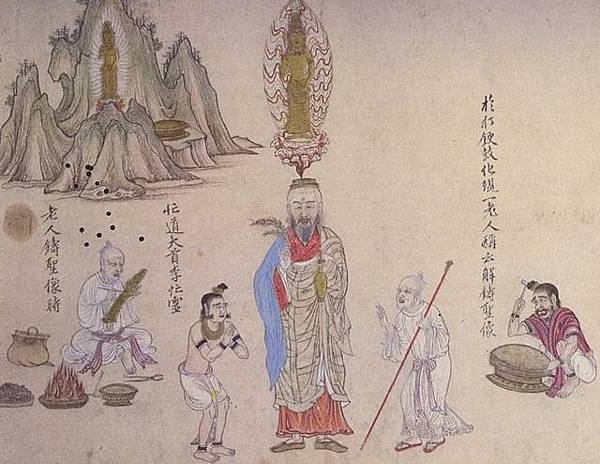 聖僧行化至忙道大首領李忙靈之界焉。其時人機闇昧,未識聖人。雖有宿緣,未可敎化。遂卽騰空乘雲,化為阿嵯耶像。忙靈驚駭,打𫒝鼓,集村人。村人旣集之,髣髴猶見聖像,放大光明。乃於打𫒝鼓之處,化一老人云:「乃吾解鎔鑄,作此聖容所見之形,毫釐不異。」忙靈云:「欲鑄此像,恐銅𫒝未足。」老人云:「但隨銅𫒝所在,不限多少。」忙靈等驚喜從之,鑄作聖像,及集村人𫒝鼓,置於山上焉。