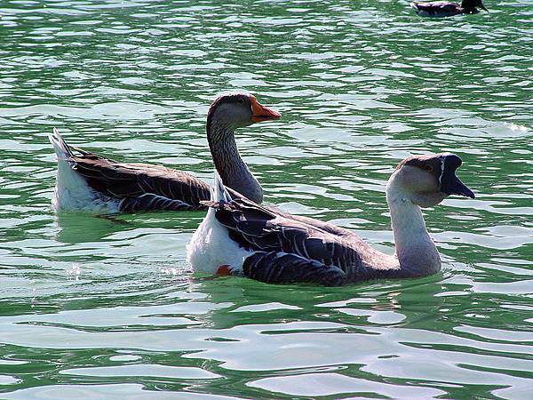 家養的一對中國鵝在游泳,雄性在前面,雌性在後面。