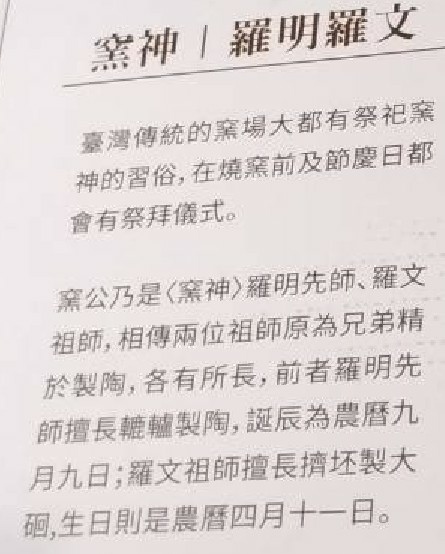 臺灣傳統的窯場大都有祭祀窯神的習俗。以土條盤築法做陶的窯場供奉「羅文祖師」;以轆轤成形法做陶的窯場供奉「羅明先師」。「羅文祖師」和「羅明先師」兩人是兄弟,都精於製陶,各有所長。哥哥羅文的技術比較厲害,不需要靠工具,用手就可以成形;弟弟的技術稍差一點,必須靠轆轤(指井上汲水的定滑輪或機器上的絞盤)才能製陶。如果我們把「羅文祖師」和「羅明先師」的文字加以重新排列組合,可以得到「文明祖先」一詞;而「羅」很容易讓人聯想到「羅盤」的字義,和「師」都有指引方向的意味。
