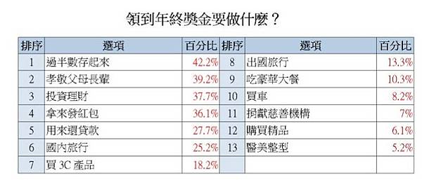 至於拿到年終獎金打算怎麼用?人力銀行調查顯示,有42.2%的打算存起來,有39.2%的人要孝敬父母長輩,37.7%要投資理財,還有27.7%要用來還貸款,也有人要用在國內旅行、買3C產品及吃豪華大餐、買車。