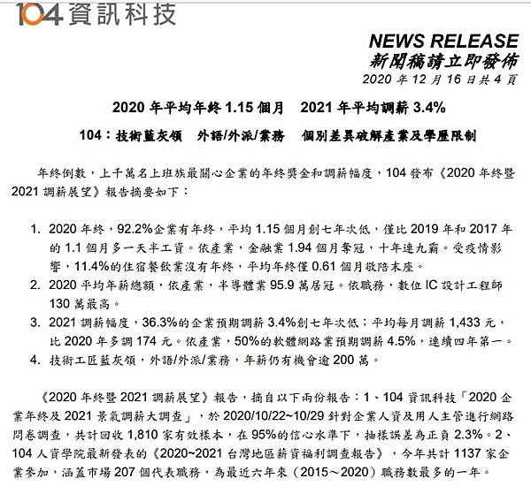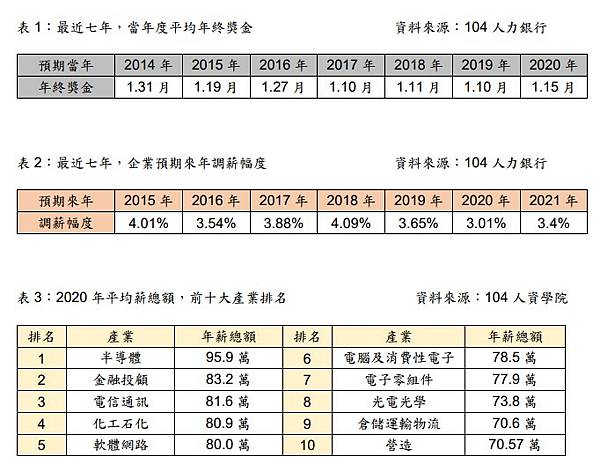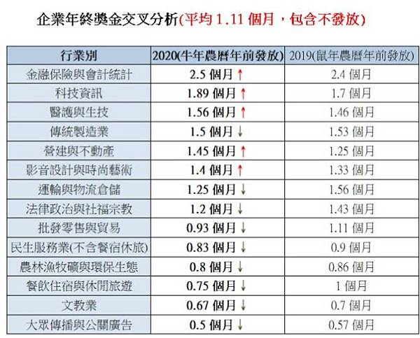 104人力銀行調查結果也是差不多,有92.2%企業會有年終,平均1.15個月,依產業別來看,金融業1.94個月再度奪冠,半導體業1.5個月、光電學業1.27個月,而受疫情影響,11.4%的住宿餐飲業沒有年終,平均年終僅0.61個月敬陪末座。
