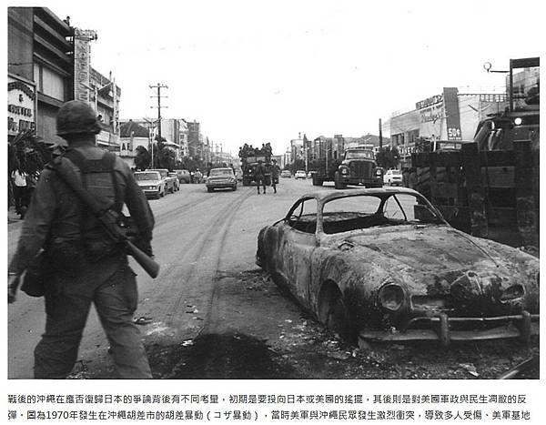 戰後的沖繩在應否復歸日本的爭論背後有不同考量,初期是要投向日本或美國的搖擺,其後則是對美國軍政與民生凋敝的反彈。圖為1970年發生在沖繩胡差市的胡差暴動(コザ暴動),當時美軍與沖繩民眾發生激烈衝突,導致多人受傷、美軍基地遭到破壞。 圖/維基共享
