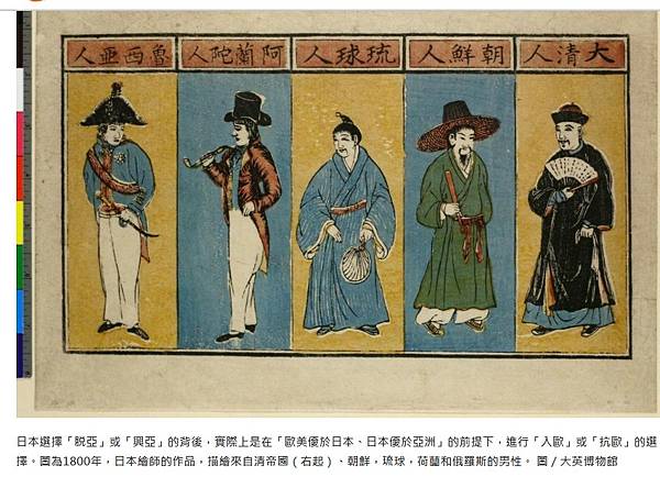 日本選擇「脱亞」或「興亞」的背後,實際上是在「歐美優於日本、日本優於亞洲」的前提下,進行「入歐」或「抗歐」的選擇。圖為1800年,日本繪師的作品,描繪來自清帝國(右起)、朝鮮,琉球,荷蘭和俄羅斯的男性。 圖/大英博物館