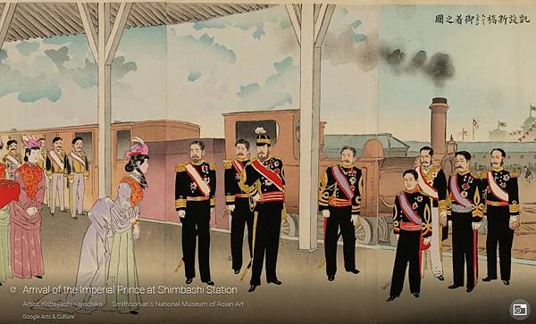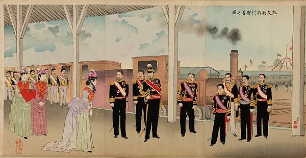 勝利後天皇抵達新橋站的插圖(外泉新橋 stēshon gochaku no zu)