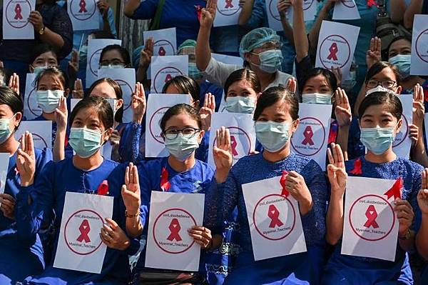 緬甸的這場政變,終結了過去10年的民主政治,重回軍事統治,招致全球譴責,怒火也在國內引爆。位於仰光的達貢大學(Dagon University)數百名師生今天在校園內發動抗議,他們戴著紅絲帶並擺出三指手勢,高唱革命歌曲,揮動全國民主聯盟代表顏色的紅旗。