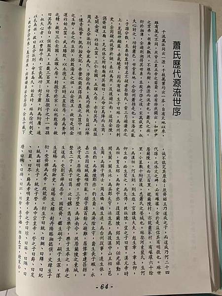 我仔細閱讀我們蕭家的祖譜,漢初三傑的蕭何,月下追韓信的蕭何,蕭規曹隨的蕭何,真的列名系譜中。在朝時建立許多佛寺,尊崇佛教,使「佛寺」又稱為「蕭寺」,讓佛教文化與儒家思想、道家情懷鼎立為影響漢人生活習性,塑造漢人人格氣質的三種文化型模之一的齊高帝蕭道成、梁武帝蕭衍,真的列名系譜中。撰寫《晉書》的蕭子雲,撰寫《後漢書》、《南齊書》的蕭子顯,真的列名系譜中。編成《文選》,使純文學能真正擺脫教化的籠絡,賦予純文學獨立生命的昭明太子蕭統,真的列名系譜中。被唐太宗讚譽為「疾風知勁草,板蕩識誠臣」的「八葉宰相」蕭瑀,真的列名系譜中。