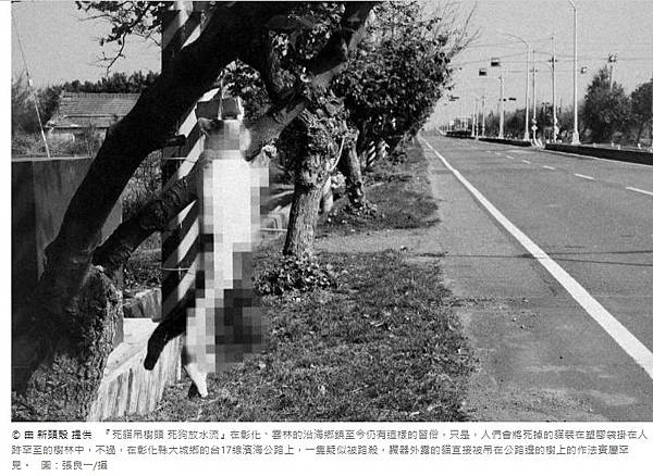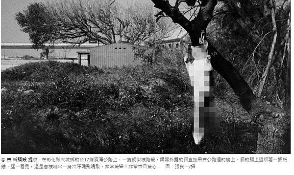 在彰化縣大城鄉的台17線濱海公路上,一隻疑似被路殺,臟器外露的貓直接吊在公路邊的樹上,貓的頭上還綁著一捆紙錢,猛一看見,還是會被嚇出一身冷汗魂飛魄散,非常驚聳!非常怵目驚心! 圖:張良一/攝© 由 新頭殼 提供 在彰化縣大城鄉的台17線濱海公路上,一隻疑似被路殺,臟器外露的貓直接吊在公路邊的樹上,貓的頭上還綁著一捆紙錢,猛一看見,還是會被嚇出一身冷汗魂飛魄散,非常驚聳!非常怵目驚心! 圖:張良一/攝