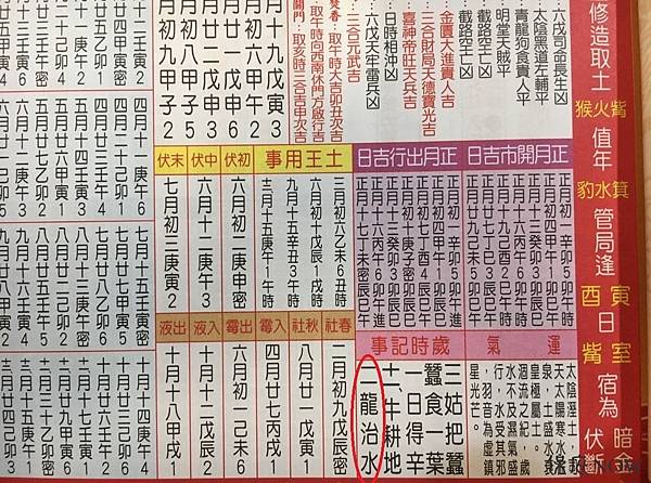 農民曆實質上的第一頁是有一個看起來像羅盤的那一頁,除了有黃帝地母經、春牛芒神圖,也記載了這一年的天赦日,然而在「歲時記事」這一欄寫的並非日期,而是像密碼一般的「幾龍治水」、「幾牛耕地」,其實都是對這一年的天候與農收的預言。