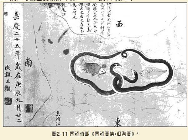 到南詔末年及大理國時期,洱海除了有一個道教的水官外,在相關的文獻記載中其內部開始出現具體的水神。 《南詔圖傳》 [61]是研究白族歷史文化的重要資料,於南詔中興二年(899)完成,由《圖畫卷》和《文字卷》兩部分組成,《圖畫卷》最末有一"洱海圖"。 圖中洱海內部畫有雌雄二蛇,紅體白腹、兩尾相連,雙頸纏繞,作交尾狀。 二蛇蟠成一橢圓形環,身體多處自然彎曲,蛇頭立於中間,身上細小的鱗片清晰可見。 左蛇抬頭閉口做嚴肅狀,為公蛇。 右蛇仰頭張口做挑逗狀,為母蛇。 在二蛇南北兩端繪有金魚和金螺各一,洱海周圍則有三條大河與外界連通(見圖2-11)。 又《文字卷》載: