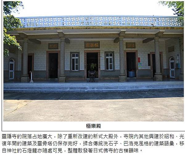 例如極樂殿、靈寶塔、靈壽塔、無緣塔等建築,都使用日治時期流行的洗石子石材,也帶有巴洛克建築風味。