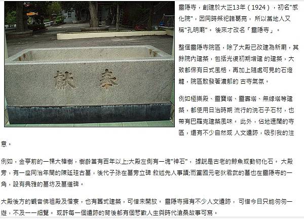 靈隱寺,創建於大正13年(1924),初名「感化院」,因同時祭祀諸葛亮,當地人稱「孔明廟」。