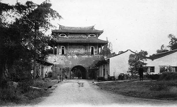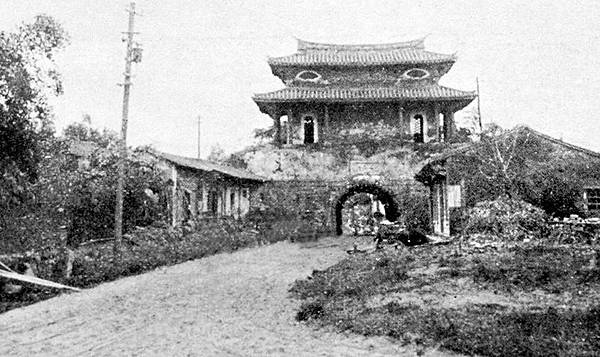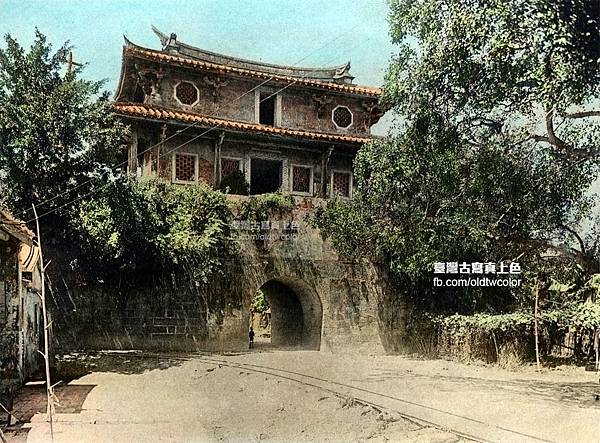 日本時代初期臺南大東門(迎春門)影像數位上色,城門外還可見到輕便臺車軌道。