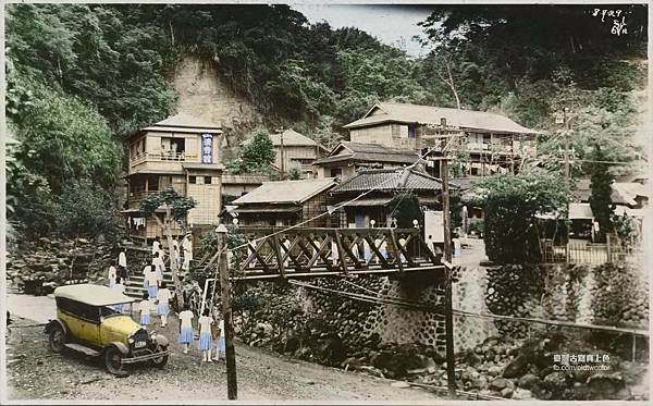 日本時代臺南第二高等女學校修業旅行,至關仔嶺溫泉拍攝之老照片數位上色。古樸又摩登的汽車、穿越閑雲橋的學生們,在綠蔭圍繞的氣氛中,一場舒暢身心的旅行正要展開呢~