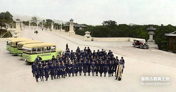 照片裡的公車是「草山、北投循環巴士」,1930年11月開始運轉,經營者是位於大和町的「巴自動車商會」,經考證顏色為「柔綠」。當時不同的公車路線有不同的營運者,外觀顏色也不盡相同。