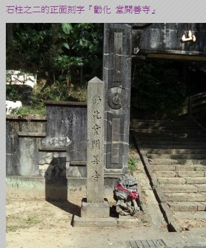 建於昭和15年(1940),為了慶祝日本皇紀兩千六百年-皇族2600週年而興建。兩支石柱「勸化堂開善寺」、「曾洞宗獅頭山」後方分別有石柱之一的背面刻字『紀元二千六百年紀念』. 石柱之二的背面刻字『住職田中應海氏』