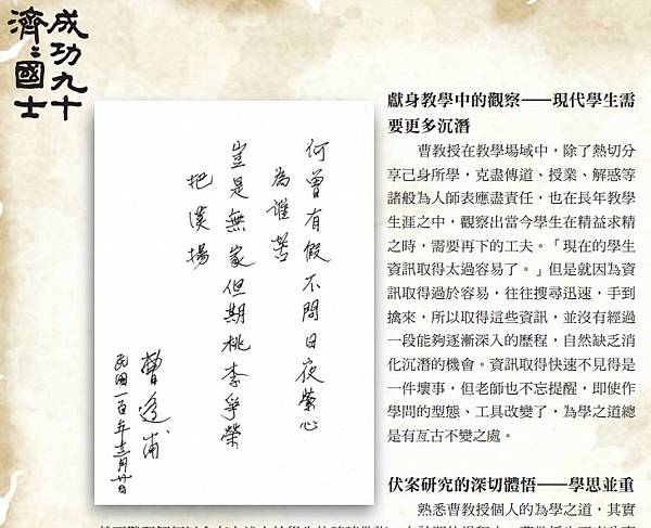 〔記者林曉雲/台北報導〕高齡80歲的國立清華大學榮譽退休教授曹逢甫,投入數十年推動本土語言,曾任教育部國語會主委,編撰閩南語常用語辭彙,投入客家語常用詞辭典編輯等工作,今天獲得教育部頒發首座「推展本土語言終身奉獻獎」。他受訪表示,自己退而不休,仍投入很多推展本土語工作,獲得教育部肯定,很高興,也覺得應該要交棒給青壯世代,繼續推動本土語文。