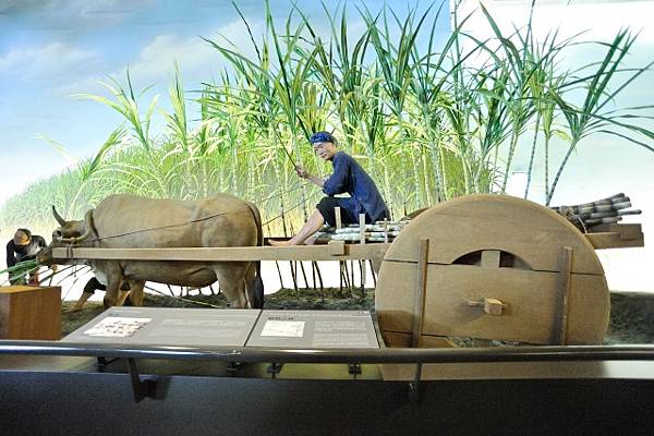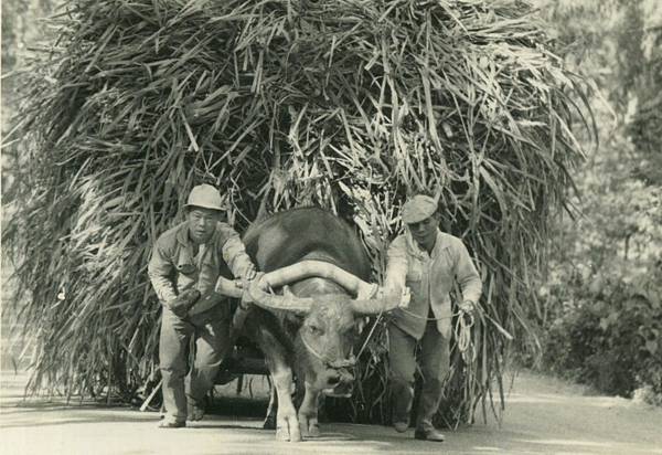 牛車上滿載的是白甘蔗,準備運往糖廠,早年白甘蔗是蔗農和台糖公司契約種植,是製糖專用,1963年政府為了保護蔗糖生產,明訂處罰損害原料甘蔗法省府1月30日府農第2字88934號,「凡損害原料甘蔗者移送法辦」, 因此白甘蔗就成了「禁蔗」,不可任意吃它。