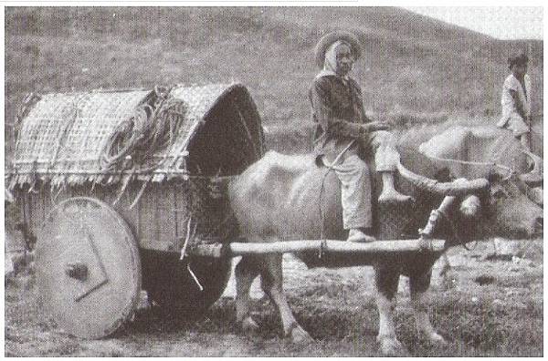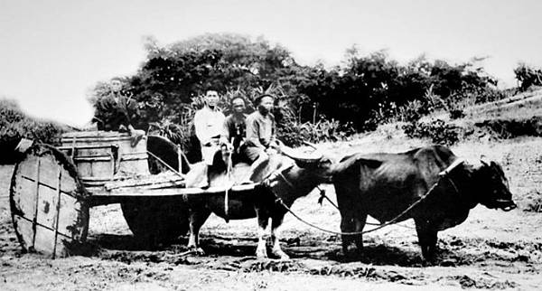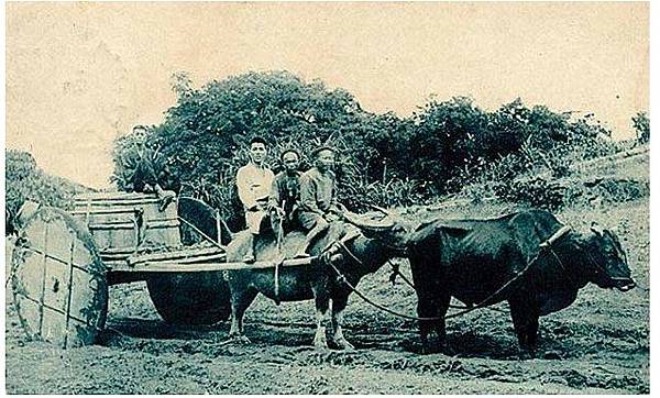 臺灣不產馬匹,因此古早時候的臺灣人如果要出遠門,便以牛車代步。本照片攝於1896...