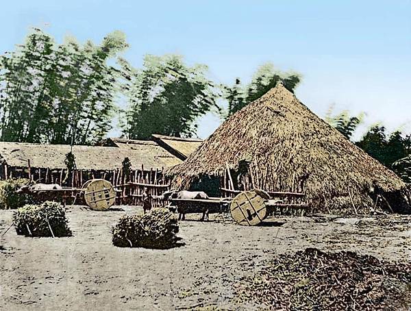 1870年代初,清同治年間,南台灣農莊。前方右側有一尖型茅草屋頂的廍亭,此為西方攝影師愛德華茲所拍攝清代台灣的珍貴照片,如實記錄了農村景觀。本圖取自1893年出版法國人于雅樂(Camille Imbault-Huart)所著福爾摩沙之歷史與地誌(L’île Formose , Histoire et Description)。該書內容詳實嚴謹,是西方第一部系統性介紹台灣的書籍,被視為西方的台灣學之權威著作。廍亭即傳統的製糖所,台灣傳統製糖技術隨著福建移民傳來台灣,廍亭内的工作包括採蔗、榨汁與煮糖等工序。為了維持寬敞的工作空間以及保護工作器具,廍亭的體積寬大,屋頂呈現尖型。由於製糖是農村重要生計,南台灣許多村莊均可見廍亭,今天高雄甲仙白雲山在清代道光年間即初名「廍亭尖」,後名廍亭山,即取其形,為南台灣著名山岳,即源於此典故。(農村生活顧問:游永福)中華之窗 | Facebook https://bit.ly/3rYULmN