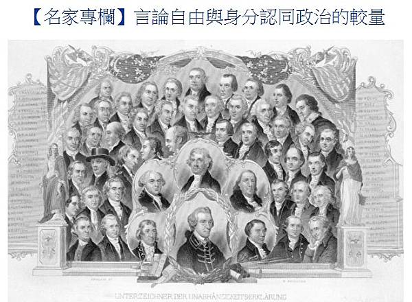 「沒有思想自由,就不可能有智慧;沒有言論自由,當然也不會有自由社會。」人一旦失去了思考的能力,無法在公共利益和人類價值方面形成理性的判斷,這時,他們就會倒向憤怒、仇恨和暴力。1776年7月4日《美國獨立宣言》簽署者的雕版肖像。《獨立宣言》的簽署者們,都深知言論自由的寶貴三點:政治自由、思想自由以及共和品行的養成