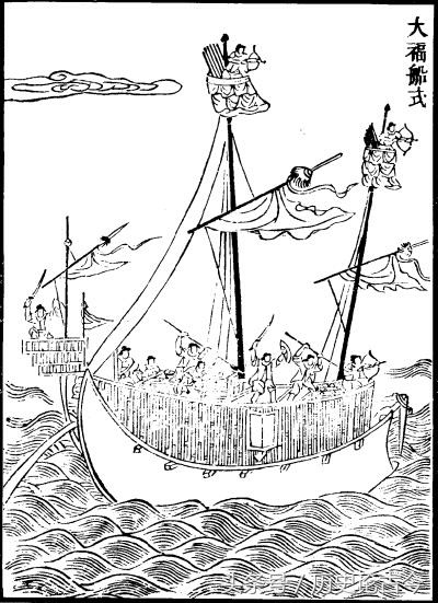 可見在時人認為水師中八丈九尺的四百料船隻就已屬「大船」,明中後期水師的頭等主力「大福船」長僅九丈(據何汝賓《兵錄》,另據《 全浙兵制 》一號福舩九丈,二號福舩八丈),卻已被稱為「高大如樓,可容百人......矢石火炮皆俯而發,敵舟之小者相遇即犁沉之,而敵又難於仰攻,誠海戰之利器也。」(鄭若曾《籌海圖編》)