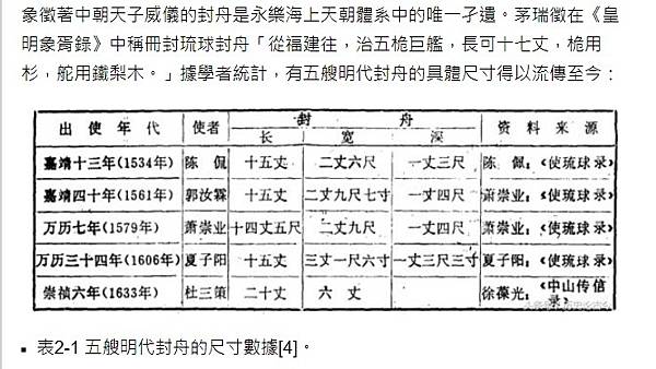 而《中山傳信錄》的作者徐葆光於康熙五十八年所用者,只是「長十丈、寬二丈八尺、深一丈五尺」與「長十一丈八尺、寬二丈五尺、深一丈二尺」的兩艘商船。