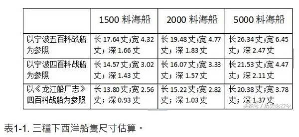 歷次下西洋中使用的寶船 「一千五百料海船」、「二千料海船」、「五千料巨舶」究竟有多大,尚無定論。然而可以確定的是即使是「五千料巨舶」的尺寸都遠遠不能達到《明史 鄭和傳》中的「長四十四丈,寬十八丈」。20世紀初,學者鄭明(海軍裝備部原部長)、辛元歐、唐志拔曾對「二千料海船」做過較為細緻的復原研究,在複製船隻尺寸時使用了中國科學院院士上海交通大學楊槱教授(今年10月17日是楊槱院士的百歲生日,祝楊老健康咸平。)給出的方法[2]:「料」是一種體積單位,假設二者船型接近,將鄭和海船的料數與已知尺寸船隻的料數之比開立方,分別乘已知尺寸船隻的各項尺寸就能得到鄭和海船的大概尺寸。鄭明等以《龍江船廠志》與嘉靖《寧波府志》中記錄的三艘400料-500料戰座船為計算參考,樓主本人在其計算基礎上補充了計算表格(取兩位有效數字):