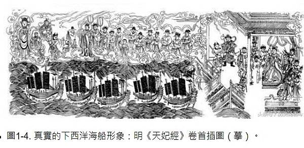 圖1-4. 真實的下西洋海船形象:明《天妃經》卷首插圖(摹)。