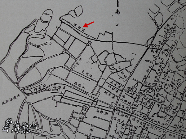 1875年台灣府城街道圖,哨船港道原在德慶溪下游出海口處,因淤沙阻滯航道,大船無法進入,台灣道臺於是招租鹿耳門新墾埔地,把所得經費用以疏濬清理開通德慶溪北面的支流,這就是後來的新哨船港。