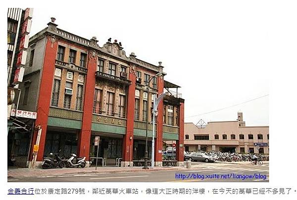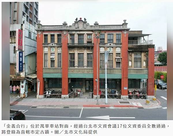 「金義合行」位於萬華車站對面,具有地標型都市景觀之意義,所有人陳氏家族捨棄建設14層樓高的商辦大樓,轉而申請為古蹟,昨日台北市文資會議,17位文資委員全數通過登錄為直轄市定古蹟,預計半年至一年,提出修復及再利用計畫。
