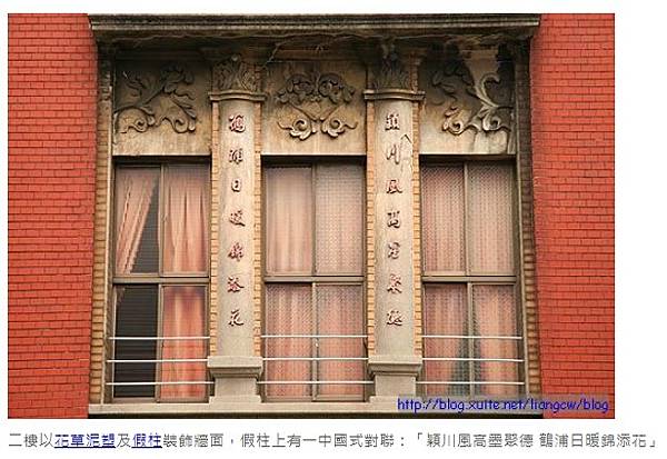 二樓以花草泥塑及假柱裝飾牆面,假柱上有一對聯:「穎川風高墨聚德,鶴浦日暖錦添花」。立面各開窗三小間,牆面飾以花草圖案的馬約卡利磁磚。