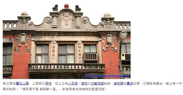 這棟三層洋樓建造於1920年代,其立面為圓形山頭,上面飾以假柱,柱上立有小石獅,邊柱用花草泥塑裝飾,並以圓球收頭。