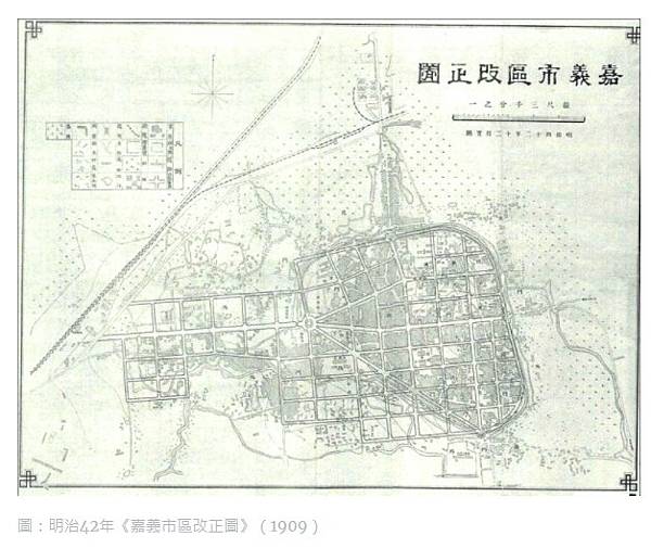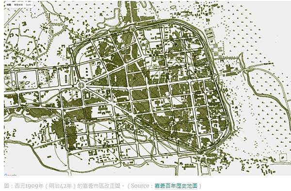 圖:西元1909年(明治42年)的嘉義市區改正圖。(Source:嘉義百年歷史地圖)